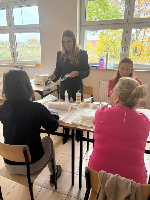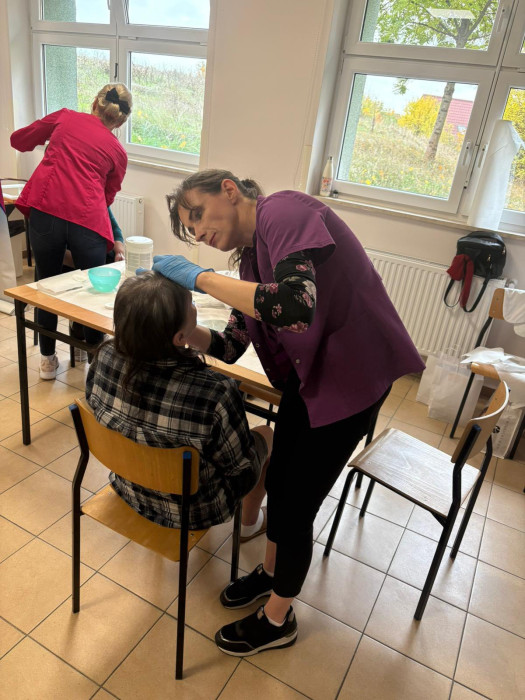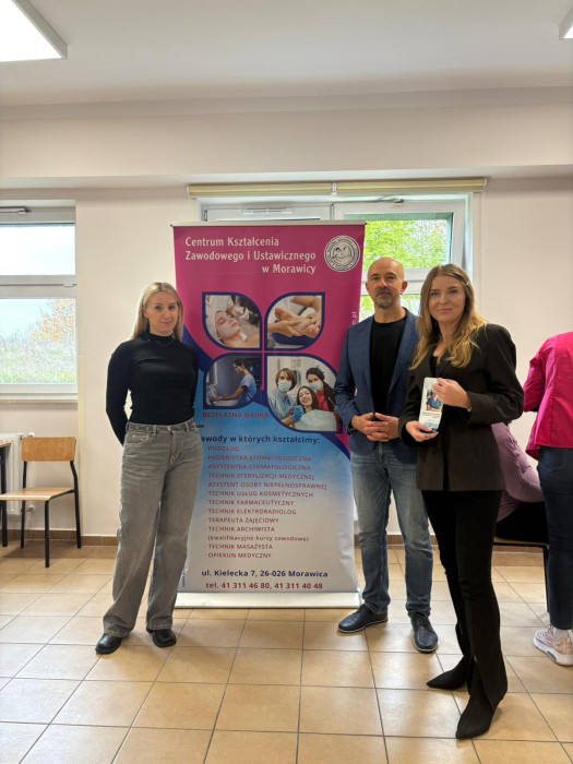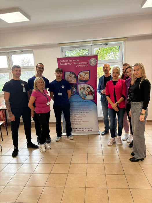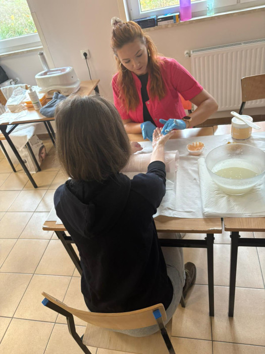 W dniu 17 października 2025 r. w ramach współpracy naszej szkoły ze Świętokrzyskim Centrum Psychiatrii w Morawicy słuchacze kształcący się w zawodach technik masażysta oraz technik usług kosmetycznych wykonywali dla pacjentek: zabiegi masażu, zabiegi pielęgnacyjne dłoni, hennę brwi.